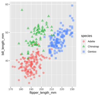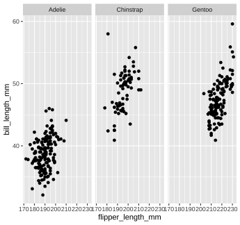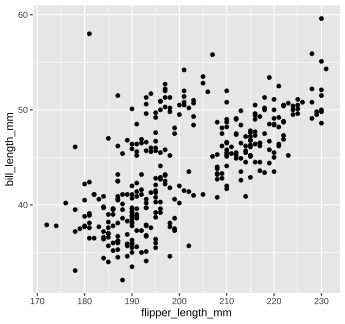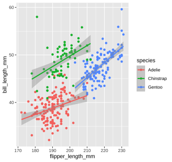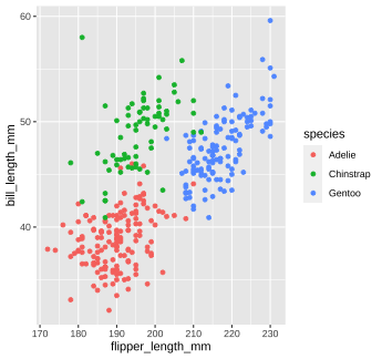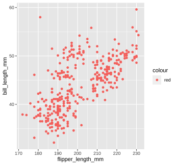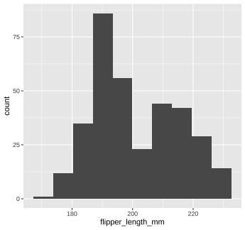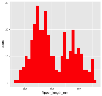The code below calculates the mean of the variable `flipper_length_mm` in the `penguins` dataset. ```r mean(penguins$flipper_length_mm, na.rm = TRUE) ``` 1. Run the code chunk provided to calculate the mean of `flipper_length_mm`. 1. Re-write the code above using the pipe operator, `%>%`. Check that the answer you get matches the original code you ran above. --- class: solution # Solution .panelset[ .panel[.panel-name[Q1] ```r mean(penguins$flipper_length_mm, na.rm = TRUE) ``` ``` ## [1] 200.9152 ``` ] .panel[.panel-name[Q2] ```r penguins$flipper_length_mm %>% mean(na.rm = TRUE) ``` ``` ## [1] 200.9152 ``` ] ] --- class: inverse, center, middle # Now back to ggplot... <img src="images/ggplot_summary.png" width="50%" style="display: block; margin: auto;" /> --- background-image: url(images/hex/ggplot2.png) background-position: 90% 5% background-size: 10% # Aesthetic mapping The basic idea with aesthetic mapping is that we want to take our data and map it onto physical space using geometric objects, or `geoms`. -- For `ggplot` to place a `geom`, it needs to know how to map aspects of the data onto the **aesthetics** (or visual features) of the graph. -- Each `geom()` function in `ggplot` takes a **mapping** argument. -- Let’s start with a basic geom, `geom_histogram()`... --- background-image: url(images/hex/ggplot2.png) background-position: 90% 5% background-size: 10% # Mapping with geoms We're going to call `ggplot()` again, and this time add the `geom_histogram()` **layer**, telling it to map the variable `flipper_length_mm` to the x-axis aesthetic -- .panelset[ .panel[.panel-name[Code] ```r penguins %>% ggplot() + geom_histogram(mapping = aes(x = flipper_length_mm)) ``` ] .panel[.panel-name[Plot] <!-- --> ] ] --- background-image: url(images/hex/ggplot2.png) background-position: 90% 5% background-size: 10% # Mapping with geoms You can add additional arguments to the `geom()`. For example, we could change the number of bins -- .panelset[ .panel[.panel-name[Code] ```r penguins %>% ggplot() + geom_histogram(mapping = aes(x = flipper_length_mm), bins = 10) ``` ] .panel[.panel-name[Plot] <!-- --> ] ] --- background-image: url(images/hex/ggplot2.png) background-position: 90% 5% background-size: 10% # Mapping with geoms Or make them a different color. We can change the color of 2-d objects with the `fill` aesthetic -- .panelset[ .panel[.panel-name[Code] ```r penguins %>% ggplot() + geom_histogram(mapping = aes(x = flipper_length_mm), fill = "red") ``` ] .panel[.panel-name[Plot] <!-- --> ] ] --- background-image: url(images/hex/ggplot2.png) background-position: 90% 5% background-size: 10% # Mapping with geoms Now we'll use a different `geom` -- we'll add a layer of points to our plot using `geom_point()` ```r penguins %>% ggplot() + geom_point(mapping = aes(x = flipper_length_mm)) ``` ``` ## Error: geom_point requires the following missing aesthetics: y ``` <!-- --> --- background-image: url(images/hex/ggplot2.png) background-position: 90% 5% background-size: 10% # Mapping with geoms We get an error, telling us that `geom_point()` requires the y-aesthetic. This makes sense -- we need an x and y axis to define where points belong on a scatter plot. Let's add `bill_length_mm` as the y-axis -- .panelset[ .panel[.panel-name[Code] ```r penguins %>% ggplot() + geom_point(mapping = aes(x = flipper_length_mm, y = bill_length_mm)) ``` ] .panel[.panel-name[Plot] <!-- --> ] ] --- background-image: url(images/hex/ggplot2.png) background-position: 90% 5% background-size: 10% # Mapping with geoms Let's find out if the relationship between `flipper_length_mm` and `bill_length_mm` relates to the species of penguin. We'll map `species` to the `color` aesthetic (similar to `fill`, but for 1-d objects). -- .panelset[ .panel[.panel-name[Code] ```r penguins %>% ggplot() + geom_point( mapping = aes(x = flipper_length_mm, y = bill_length_mm, color = species)) ``` ] .panel[.panel-name[Plot] <!-- --> ] ] --- background-image: url(images/hex/ggplot2.png) background-position: 90% 5% background-size: 10% # Mapping with geoms Notice that we included `color` **inside** our aesthetic mapping call (`mapping = aes()`) here, but not when we filled our histogram with the color red earlier -- This is the difference between mapping an aesthetic to **data** and just setting an aesthetic to some **value** (e.g., "red"). -- This is a fairly common mistake, so let's take a look at an example --- background-image: url(images/hex/ggplot2.png) background-position: 90% 5% background-size: 10% # Mapping with geoms What happens if we tell `ggplot` to make our points red but accidentally include that **inside** the `aes()` call? -- .panelset[ .panel[.panel-name[Code] ```r penguins %>% ggplot() + geom_point(mapping = aes(x = flipper_length_mm, y = bill_length_mm, color = "red")) ``` ] .panel[.panel-name[Plot] .pull-left[ <!-- --> ] .pull-right[ This is not what we want! `ggplot` is treating the value "red" as if it were part of our data, which it isn't ] ] ] --- class: inverse # Your Turn 2