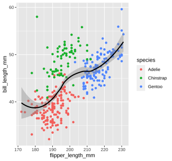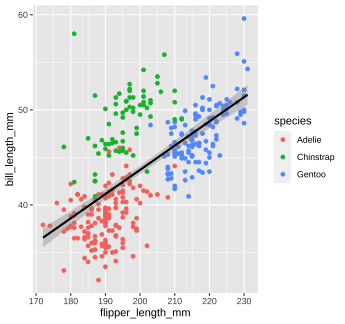 1. Create a scatter plot to visualize the relationship between `flipper_length_mm` and `bill_length_mm`. 1. Build on your plot above by adding an aesthetic to visualize the effect of `species`. Choose any aesthetic you’d like or play around with a few. What do they do? How might you use more than one aesthetic? *Note:* Options for aesthetics include `color`, `shape`, `size`, and `alpha` (transparency, 0-1 scale). --- class: solution # Solution ## Q1 .panelset[ .panel[.panel-name[Code] ```r penguins %>% ggplot() + geom_point(aes(x = flipper_length_mm, y = bill_length_mm)) ``` ] .panel[.panel-name[Plot] <!-- --> ] ] --- class: solution # Solution ## Q2 (answers will vary...) .panelset[ .panel[.panel-name[Code] ```r penguins %>% ggplot() + geom_point(aes(x = flipper_length_mm, y = bill_length_mm, color = species, shape = species), alpha = 0.5, size = 3) ``` ] .panel[.panel-name[Plot] <!-- --> ] ] --- background-image: url(images/hex/ggplot2.png) background-position: 90% 5% background-size: 10% # Mapping with geoms We could also make separate graphs for each `species` using `facet_wrap`. We do this by passing a one-sided formula to `facet_wrap()` -- .panelset[ .panel[.panel-name[Code] ```r penguins %>% ggplot() + geom_point(aes(x = flipper_length_mm, y = bill_length_mm)) + facet_wrap(~species) ``` ] .panel[.panel-name[Plot] <!-- --> ] ] --- background-image: url(images/hex/ggplot2.png) background-position: 90% 5% background-size: 10% # Mapping with geoms Another thing we often want to do is to add a line over our scatterplot to describe the linear relationship between variables. We can do this by adding a `geom_smooth()` layer to our plot. -- .panelset[ .panel[.panel-name[Code 1] ```r penguins %>% ggplot() + geom_point(aes(x = flipper_length_mm, y = bill_length_mm, color = species)) + geom_smooth(aes(x = flipper_length_mm, y = bill_length_mm), color = "black") ``` ] .panel[.panel-name[Plot 1] .pull-left[ <!-- --> ] .pull-right[ Note that "loess" is the default function for geom_smooth(). Learn more on that [here](http://www.statisticshowto.com/lowess-smoothing/). ] ] .panelset[ .panel[.panel-name[Code 2] You can change that by setting the `method` argument in `geom_smooth()`. Let's change it to our old friend linear regression or "lm" ```r penguins %>% ggplot() + geom_point(aes(x = flipper_length_mm, y = bill_length_mm, color = species)) + geom_smooth(aes(x = flipper_length_mm, y = bill_length_mm), color = "black", method = "lm") ``` ] .panel[.panel-name[Plot 2] <!-- --> ] ] ] --- background-image: url(images/hex/ggplot2.png) background-position: 90% 5% background-size: 10% # Global aesthetic mapping Our code so far has been getting rather inefficient. We're specifying the x and y axis for each `geom_*` call. -- *** Instead, we can use **global** aesthetic mappings, which are specified in the `ggplot()` call. -- Global mappings are inherited by each layer unless they're overwritten. --- background-image: url(images/hex/ggplot2.png) background-position: 90% 5% background-size: 10% # Global aesthetic mapping Let's re-make our previous plot using global aesthetic mapping -- .panelset[ .panel[.panel-name[Code] ```r penguins %>% ggplot(aes(x = flipper_length_mm, y = bill_length_mm))+ geom_point(aes(color = species)) + geom_smooth(color = "black", method = "lm") ``` ] .panel[.panel-name[Plot] <!-- --> ] .panel[.panel-name[Explanation] So...what do we put in global aesthetic mapping and what do we put in the aesthetic mapping of specific geoms? You want to put anything in the global mapping that you want *every layer to inherit* (or at least the majority of them). In the code above, I defined the `x` and `y` aesthetics globally, because I want those the same in every `geom`. However, I *don't* define the `color` aesthetic globally, because `color` is geom-specific in this case. ] ] --- background-image: url(images/hex/ggplot2.png) background-position: 90% 5% background-size: 10% # Global aesthetic mapping Let's take a look at the previous example again, but this time with `color` in the global aesthetic... -- .panelset[ .panel[.panel-name[Code 1] ```r penguins %>% ggplot(aes(x = flipper_length_mm, y = bill_length_mm, color = species))+ geom_point() + # inherit global geom_smooth(method = "lm") #inherit global ``` ] .panel[.panel-name[Plot 1] .pull-left[ <!-- --> ] .pull-right[ As you can see, global aesthetic mapping gets inherited by every layer. We can override this by providing a different aesthetic mapping in individual `geom()` calls... ] ] .panel[.panel-name[Code 2] ```r penguins %>% ggplot(aes(x = flipper_length_mm, y = bill_length_mm, color = species))+ geom_point() + #inherit global geom_smooth(method = "lm", color = "black") #override global `color` ``` ] .panel[.panel-name[Plot 2] <!-- --> ] ] --- class: inverse # Your Turn 3